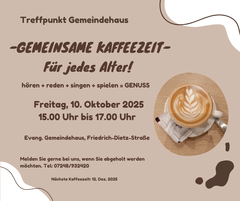 Herzliche Einladung zur gemeinsamen Kaffeezeit am 10. Oktober 2025 von 15:00 Uhr bis 17:00 Uhr im Evang. Gemeindehaus Ittersbach!