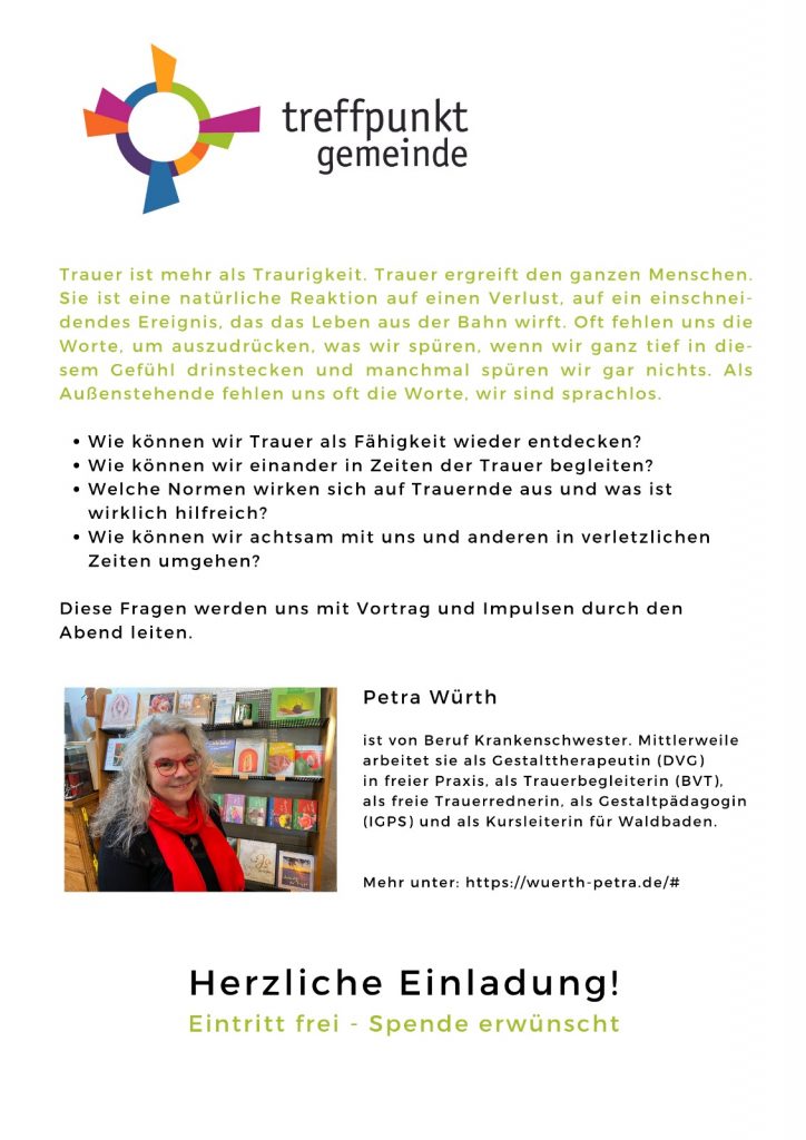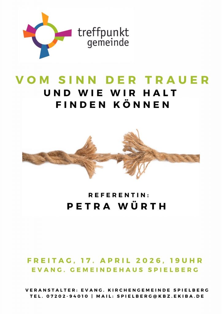 Vom Sinn der Trauer – und wie wir Halt finden können“. Zu diesem Thema, mit dem die meisten von uns persönlich vermutlich schon zu tun hatten, wird Petra Würth am Freitag, 17. April, um 19 Uhr im evang. Gemeindehaus in Spielberg sprechen. Petra Würth ist Autorin, freie Rednerin und Gestalttherapeutin. Sie hat bereits mehrere Bücher zum Thema „Trauer“ geschrieben und ihre eigenen Erfahrungen in der Trauerbegleitung von Menschen reflektiert. Freuen Sie sich auf einen interessanten Abend zu einem (ge-)wichtigen Thema! Der Eintritt ist frei. Wir freuen uns über eine Spende zur Deckung der Unkosten. Herzliche Einladung!